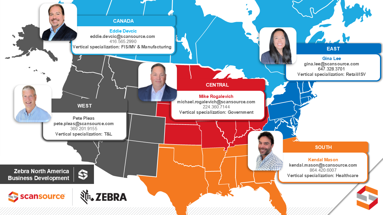 ScanSource is home to a team of five Zebra-exclusive Business Development Managers who offer extensive product knowledge, a full portfolio of Zebra solutions, and an array of demo equipment to best serve our sales partners. With 100 years of collective industry experience, the BDs are strategically located throughout the U.S. and Canada, each serving their own geographic region and helping unite their customers with subject-matter experts at Zebra to devise the best possible solution for each end user.